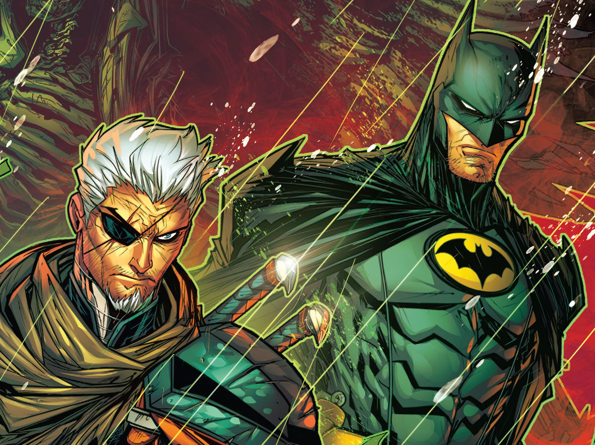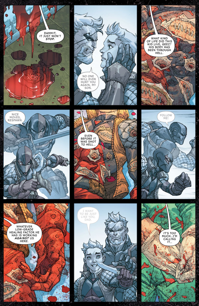 Ray: Last chapter ended with Slade’s newly discovered “son” Respawn seemingly dying in a hail of bullets—and this issue removes all hope, although the kid’s name makes me wonder if all is as it appears to be. This unleashes Slade like we’ve rarely seen—a Deathstroke truly motivated by rage rather than money or pettiness. He tears through much of the opposition, including a brutal attack on Ghost-Maker’s headquarters to retrieve his team, and prepares for a final march on Talia’s headquarters now that they’ve both lost someone to this war. But as we know, this is all a shell game created by a third party—and Batman finally confronts the masked fake Deathstroke, who drops some intriguing hints as to exactly who he is. A lot of suspects come to mind, but no clear reveals. Overall, this is an intriguing chapter, but definitely feels like it’s setting the stage for something much bigger in the final two chapters.