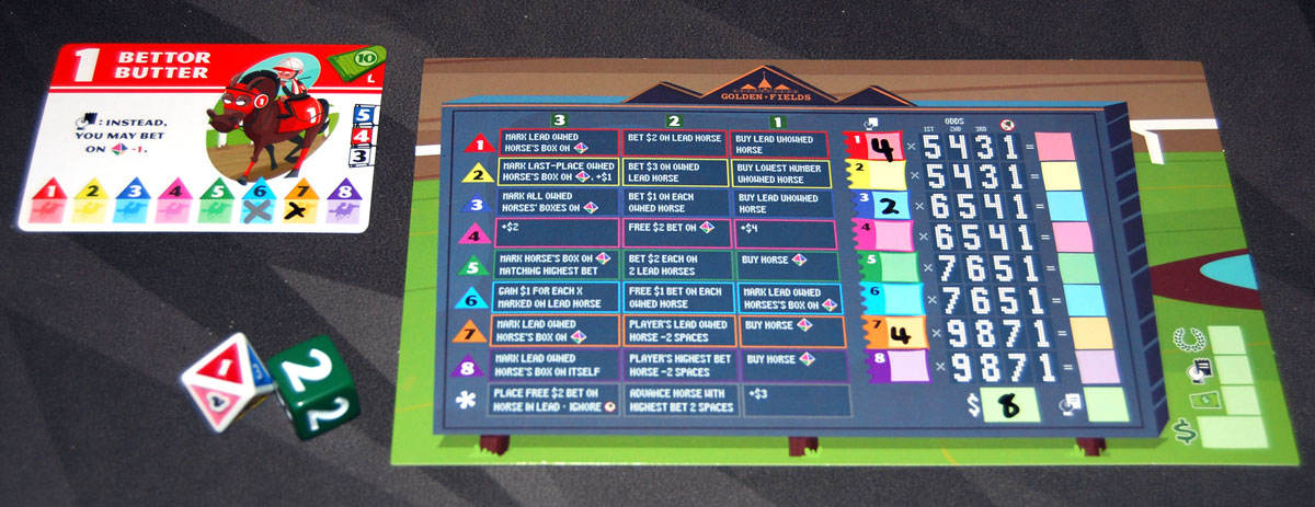 The jerseys are where things get really wild, because that’s how you start manipulating the odds. At the start of the game, the lower numbered horses are favored to win and have lower payouts, because their numbers are already marked on more of the horses. For instance, 1 and 2 are already marked on 3 cards each, which means that there’s a pretty good chance that they’ll get bonus moves. On the other hand, poor 7 and 8 aren’t marked at all, which means they’ll only move if somebody rolls their number. Getting a jersey lets you mark an X, making a horse more likely to move. If you managed to get all 8 jerseys and used them all to mark #8, you’d guarantee that Nitro Nellie would move a space on every turn—though if you do that, make sure you have enough actions to place some bets on that horse, too. (Marking the horse’s number on its own card means that when its number is rolled, it moves an extra space!) I liked the way that the payouts reflect the bonus moves—it’s a clever way of tying the bets to the odds of the horse winning.