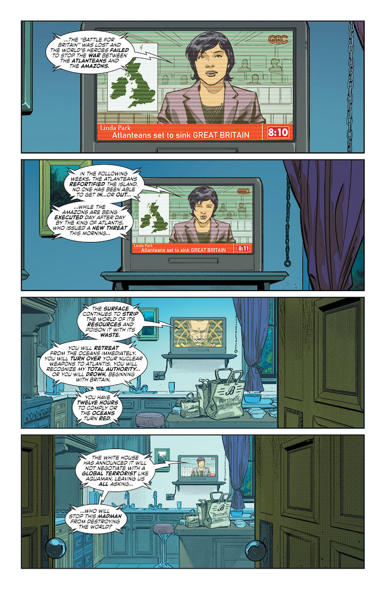 Ray: The Flashpoint universe is one of the most chaotic alternate universes ever to appear at DC, and the first issue of this miniseries was almost… calm by that standard. Focusing on Thomas Wayne as he once again found himself stranded where it all began, it focused on him stalking this world’s Barry Allen to try to recreate the Flash—only to see Barry unexpectedly assassinated. Now, having less hope to escape this hellish world, he’s forced to leave Gotham and insert himself into the massive conflict sweeping the globe—between Aquaman and Wonder Woman, both of whom have been seriously villainized in this world. After reluctantly taking in Harvey Dent’s surviving child and pawning him off on a servile Oswald Cobblepot, he heads to infiltrate Atlantis-occupied Britain—which Arthur plans to drown in a day, including the entire captured Amazon army and Wonder Woman herself.