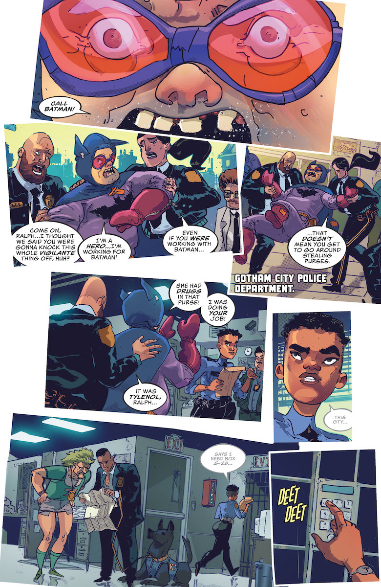 Ray: Harley may be free now, as Batwoman has broken her out of Blackgate, but her problems are far from over. She’s been framed for murder, and the only officer who believes her—Jaylin Shaw—is being constantly stymied by her superiors who refuse to consider any alternative to Harley’s guilt. This part of the issue is very funny, particularly Harley’s paper-thin disguises and her insistence on stopping for fast food in the middle of her escape attempt. But in the background is a pretty dark and disturbing murder mystery, as the twisted Verdict continues to take trophies of her dead. It’s probably a coincidence that Verdict’s MO seems so similar to Riddler’s over in Detective Comics—both are pulling off killing streaks that only seem to target those who have “earned it” in some way. And the evidence that might just save Harley is locked up deep in GCPD headquarters.
