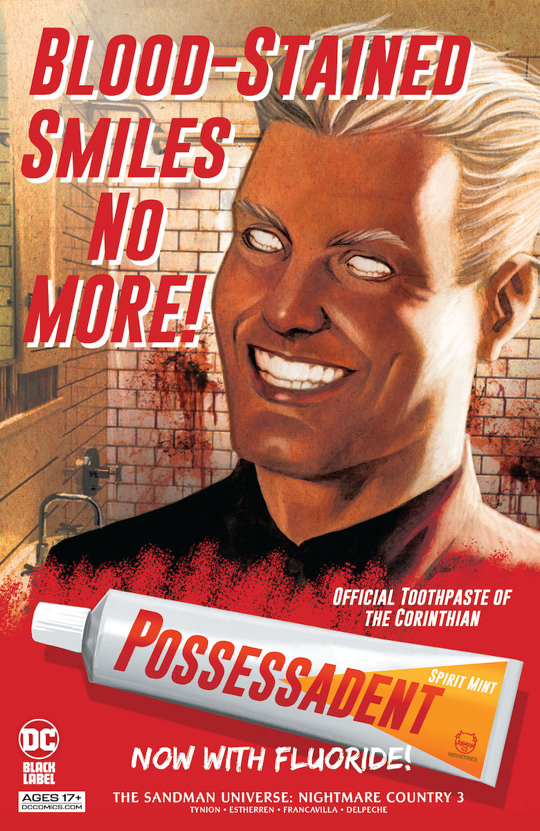 With nowhere else to turn, Madison seeks out her frenemy Robbie—who is currently spending the night with his paramour, a politically powerful millionaire named Bill Teague, who might know more about this horror show than he’s letting on. The creepy visuals let up once Madison finds this safe haven, and Bill seems to know how to keep everyone safe, but the tension never lets up. And then there’s the two splash-page segment drawn by Francesco Francavilla, the only segment of this issue that actually features the Corinthian in person. Wonderfully haunting and beautiful, with deliriously creepy visuals of newly-formed nightmares, it’s the perfect example of how the creative teams’ imagination drives this series. After all, we can’t really have a series about nightmares without some surreal visuals, can we? More than any other book in the Sandman Universe line, this one feels like it’s paying tribute to the original vision.