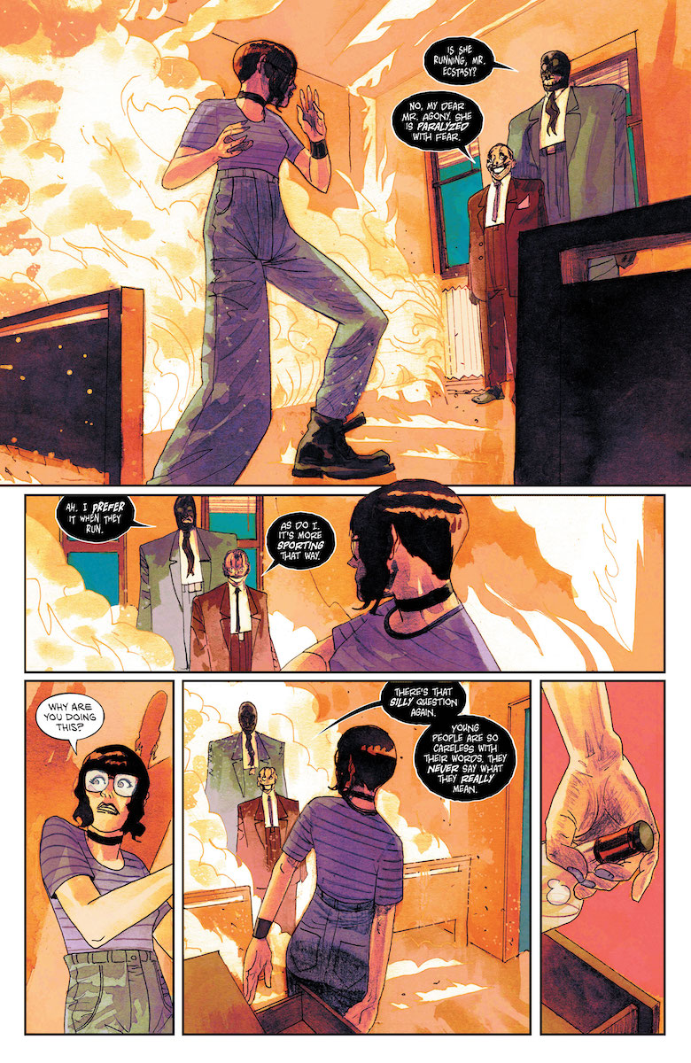 Ray: James Tynion IV came back from work-for-hire retirement for this book, so you know it’s going to be something special. He’s one of the current masters of horror in comics, and there are few things more horrific than his lead character here—The Corinthian, one of the most nightmarish creations of the Dreaming. But as we saw in the first two issues, The Corinthian may not be the most disturbing thing in the book. That goes to the original creations of Mr. Agony and Mr. Ecstasy. As the issue opens, the two of them torment the haunted Madison Flynn as they lay waste to her apartment building and send her on the run. We’ve seen some masters of gore and horror before, but there’s something about the businesslike, almost joyful way these two commit their atrocities that makes them stand out as truly disturbing. A scene at the end of the issue is definitely going to stick with me for a long time.