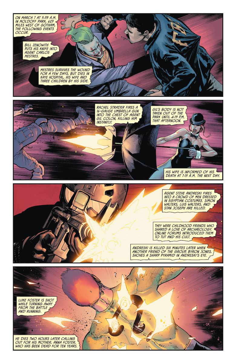 Ray: For the first few issues, this miniseries was sort of esoteric—a collection of compelling but not all that clear events that seemed to be building to something. What was the mysterious object stolen from a vault in a Gotham bank? Why did the villains, Batman, and even the US Government want it so much? It’s all been building to this, in an issue broken down by seconds. The story opens with one of the most brutal fight scenes ever put to a comic page, certainly one of the most intense ever in a DC Comic. As the forces of the federal government clash with an army consisting of hundreds of the Gotham villains’ most brutal henchmen, dozens die in fairly graphic ways that earn the Black Label designator—and it’s hinted that some big players may be taking the opportunity to get their blood in personally. How did this begin? The story flashes back to earlier for a tale of greed and arrogance.