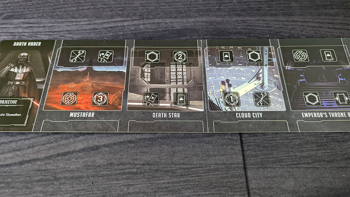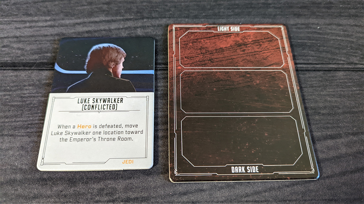 During setup, the Luke Skywalker tile is placed above the Death Star, with its “focused” side up. Unlike other heroes, Luke does not block actions, and he’s not even technically a hero but is classified instead as a Jedi. Once Vader finds one of the cards that causes Luke to flip to the “conflicted” side, he moves one location closer to the Emperor’s Throne Room each time another hero is defeated by Vader. Once he gets there, Vader may pay 6 ambition to defeat Luke and win the game.