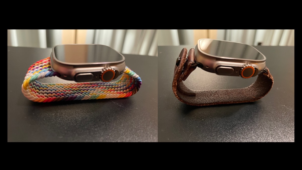 But that isn’t the complete story. I actually have two watch bands that no longer fit when paired with the Ultra. Because the Apple Watch Ultra case is both wider and taller (specifically taller) than the previous 42mm, 44mm and 45mm Apple Watches, any type of band that was a continuous loop is now going to be a different size (slightly larger) because it now has a taller Apple Watch that completes the loop. Pictured below are two example of Apple Watch bands that now don’t fit me while wearing them with the new Apple Watch Ultra. One is the Pride Edition Braided Solo Loop and the other is the Button-Stud Apple Watchband from Form Function Form.