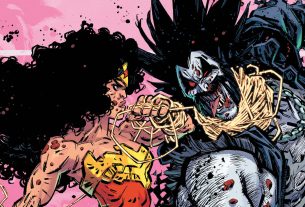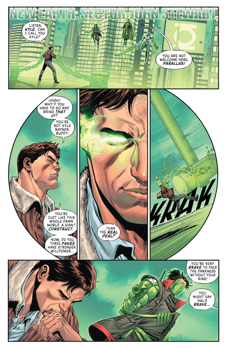 Ray: Halfway through this event, the heroes are still scattered across this world and beyond, but the divergent plots don’t make this any less compelling. Hal Jordan faced off against the forces of Pariah and the Great Darkness and somehow survived—and now he’s found himself on John Stewart’s perfect world, met with construct versions of his closest friends. He’s massively outmatched—but he’s not alone, as Barry Allen has broken free of his lotus-eater machine and is seeking to free the rest of the League as well. The two of them make a break for it and eventually find their way to Batman’s world. We haven’t seen this one yet, but it’s hard to imagine how this gritty steampunk world would be anyone’s ideal world—although Batman isn’t any hero. He’s a little disturbed, and the brief glimpse we see of him seems to lean into that. But as exciting as these adventures are, we haven’t even seen Earth-0 yet.