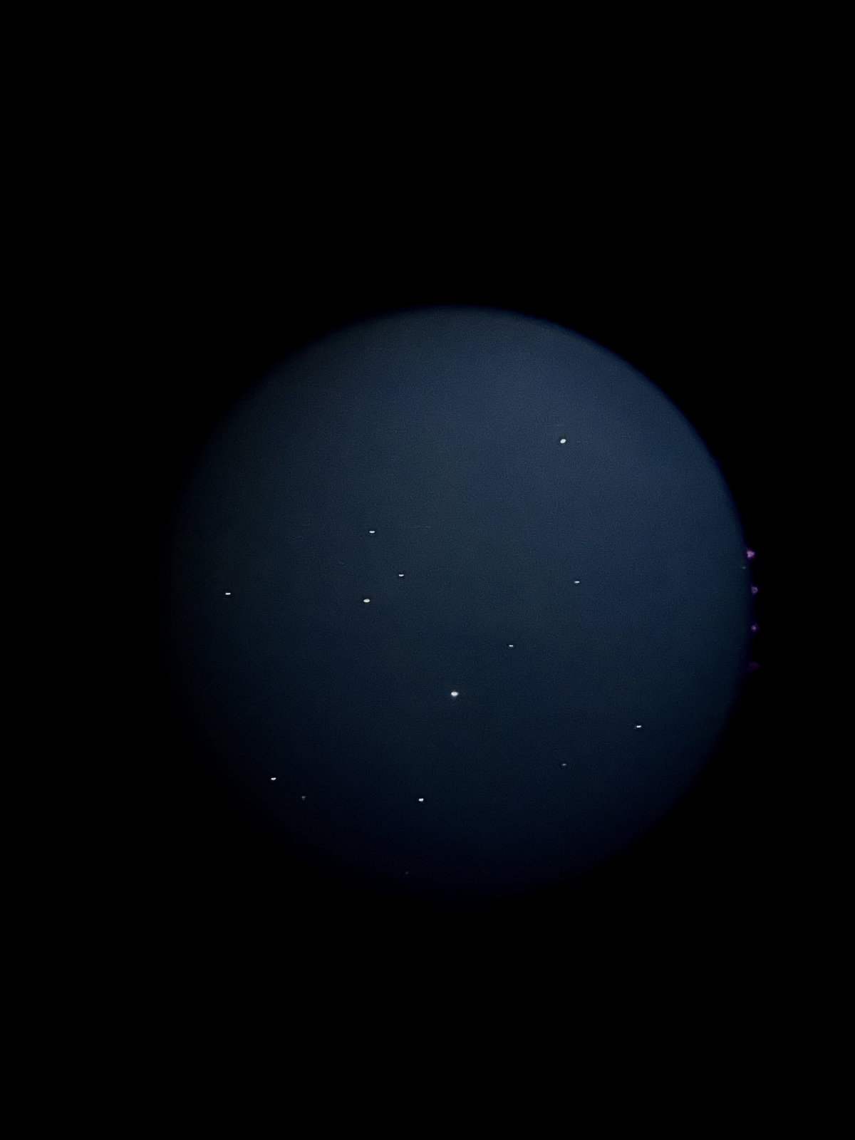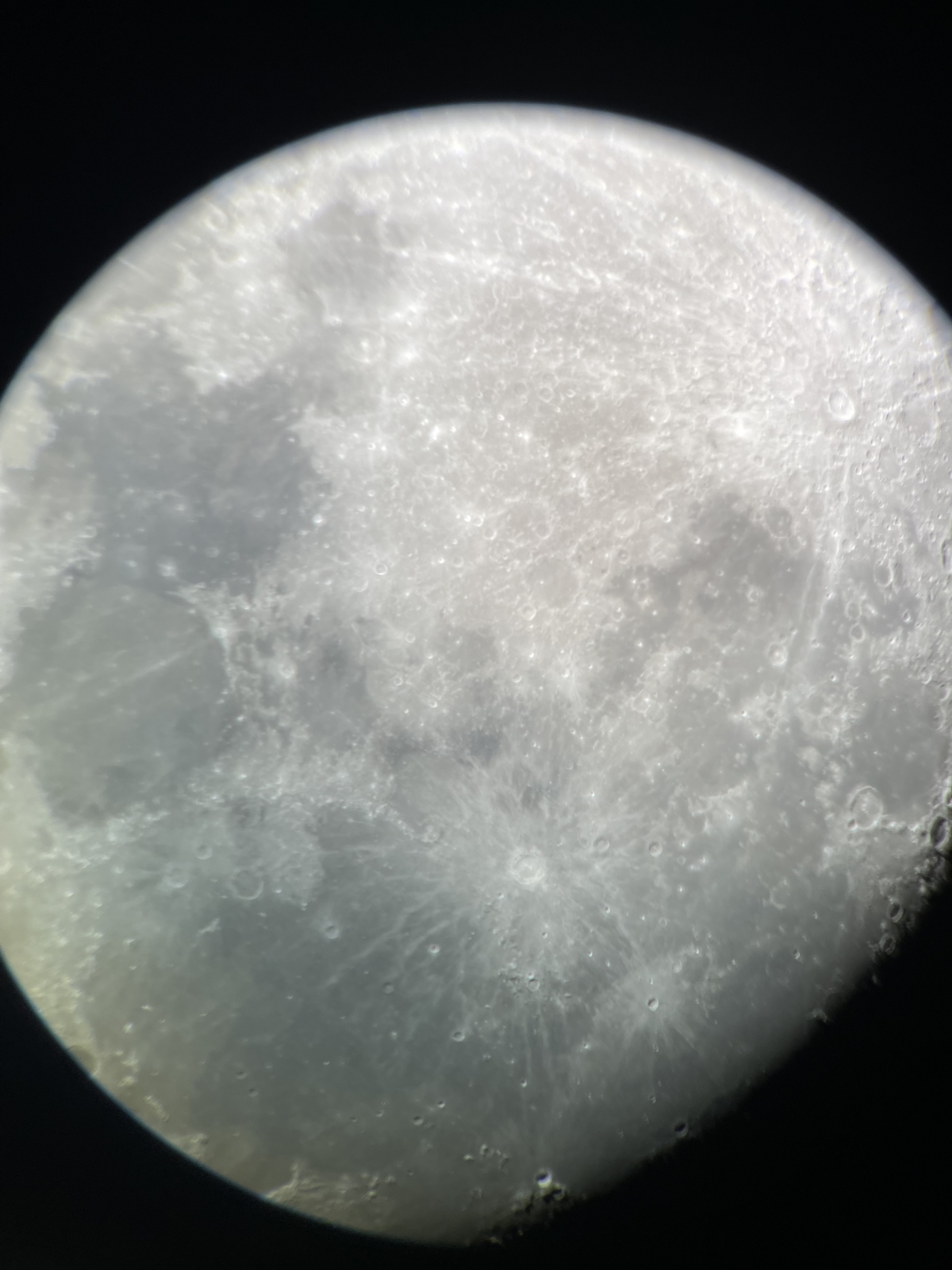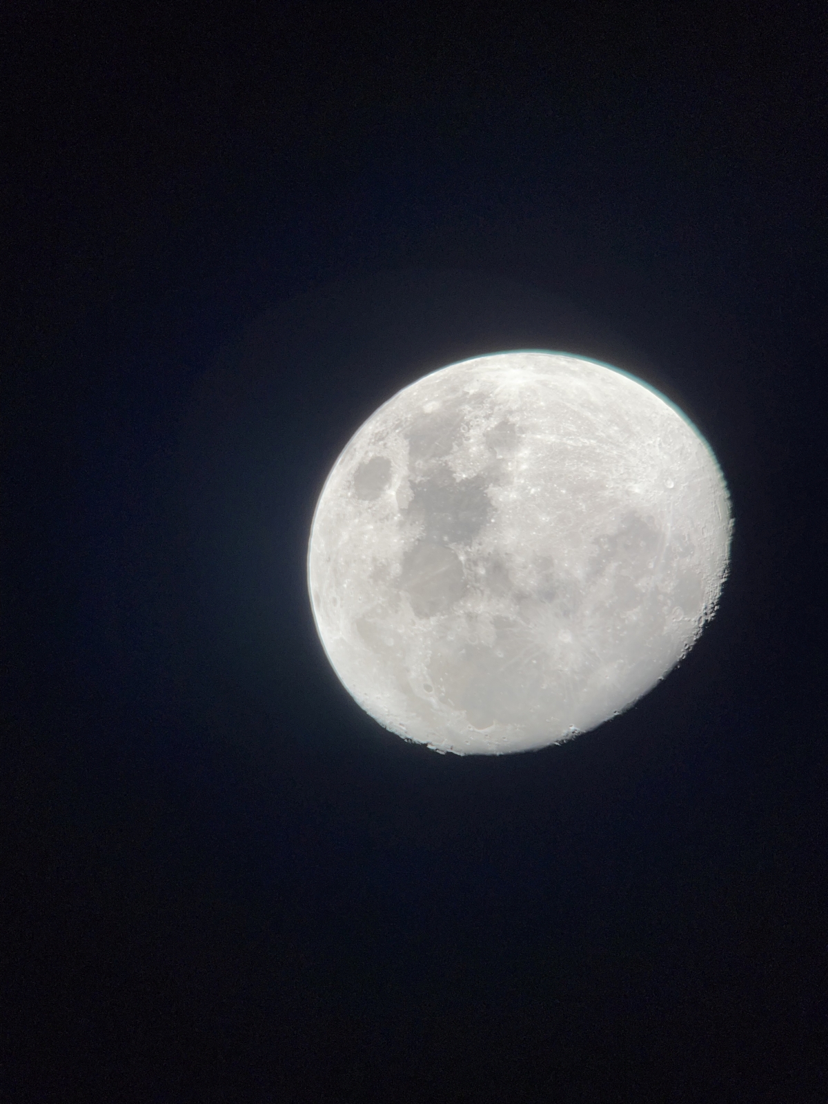 The Celestron StarSense Explorer 8″ Dobsonian comes with just one eyepiece, a 25mm Plössl. Here’s a view of the moon, shot on my cell phone using the standard eyepiece and a cell phone mount, which clamps onto the eyepiece: