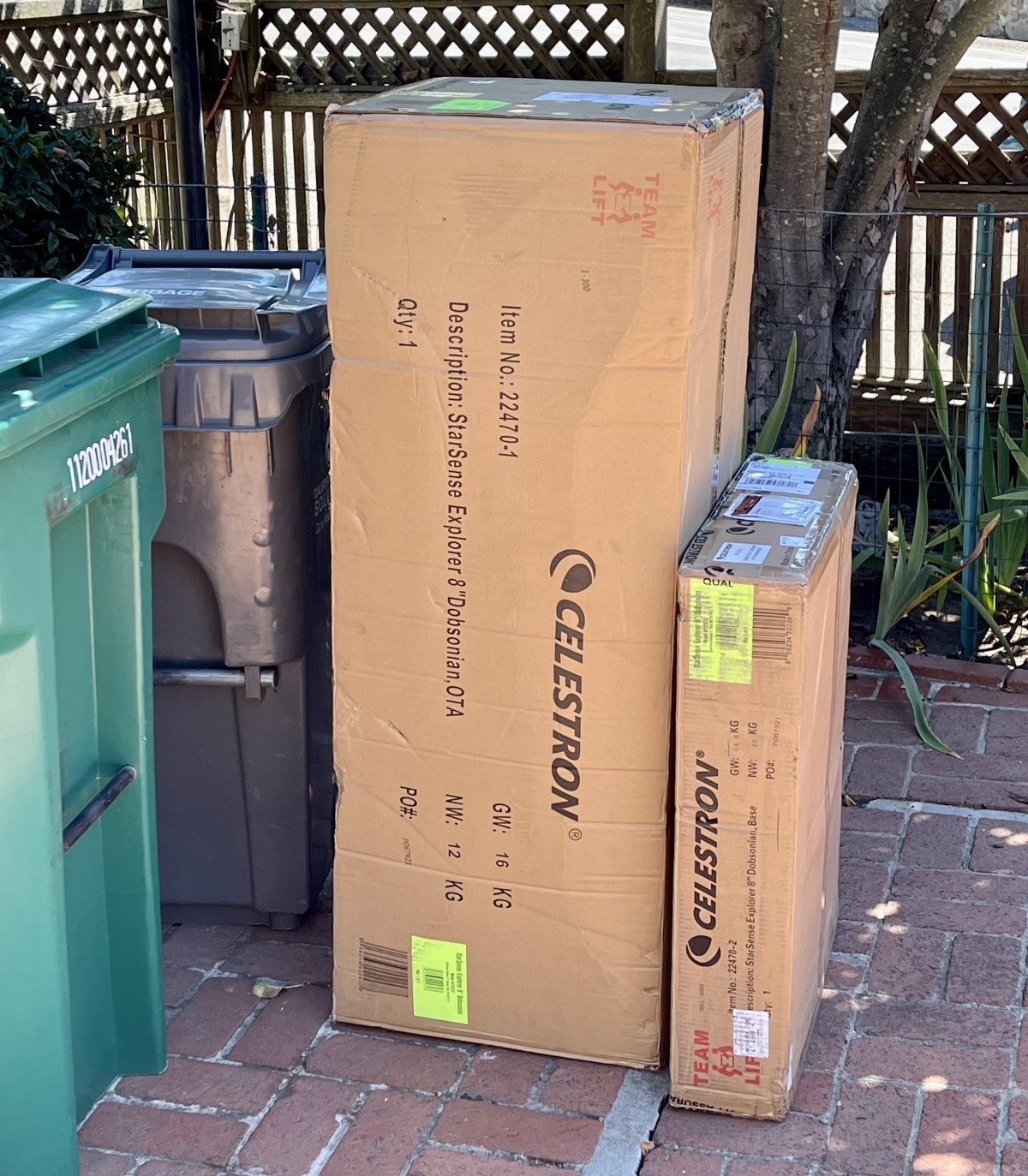 The Celestron StarSense Explorer 8″ Dobsonian ships in two separate boxes. One of them holds the telescope tube and accessories, while the other holds all the parts necessary to build the Dobsonian base.