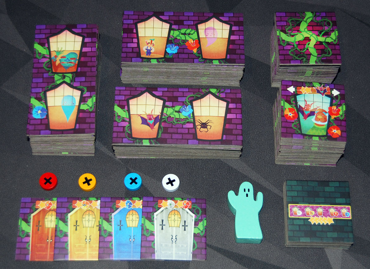 Shuffle each stack of tiles separately and set them face-down. Place 6 window tiles face-up in the center of the play area and place the ghost meeple on one of them. Place 4 guest tiles face-up. Draw one bonus tile and place it face-up, returning the rest of the bonus tiles to the box.