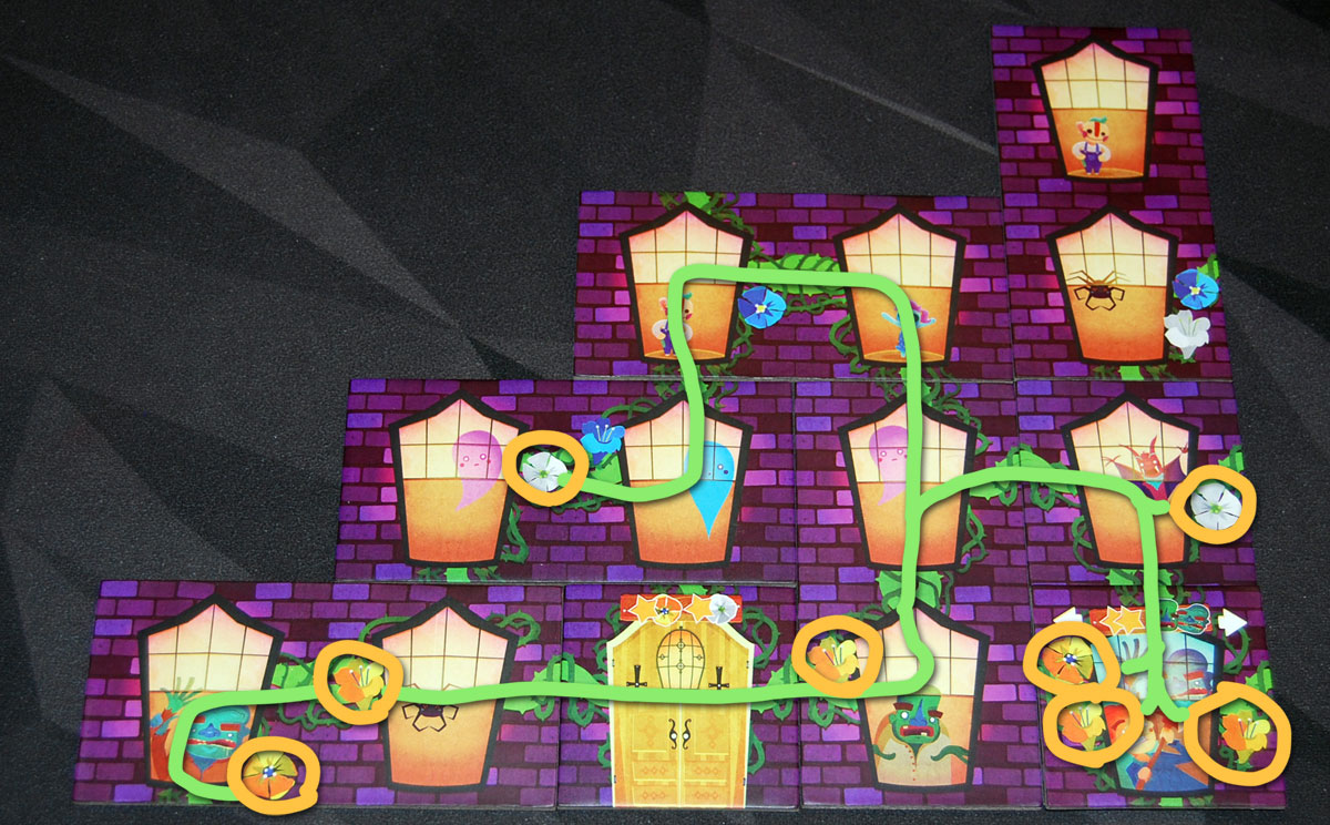 You also score points for flowers, but there are some restrictions. You only score points for the two colors of flowers shown above your door, and flowers are only worth points if they are connected to your front door via vines. Wall tiles and guest tiles connect vines in all four directions, but window tiles have limited connections. Each matching flower that is connected to your door is worth 1 point.