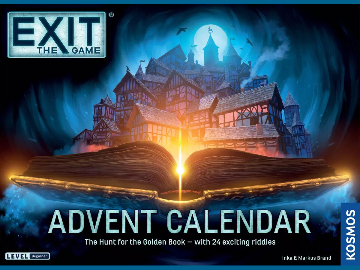 Exit: The Game – Advent Calendar: The Hunt for the Golden Book (yes, the full title is a mouthful) is a puzzle adventure game for 1 or more players, ages 10 and up, and takes 24 days to play. (Okay, not 24 full days, but it’s an advent calendar so you get one puzzle a day, and each puzzle varies in length, depending on how long it takes you to figure out the answer.) It retails for $49.95 and is available in stores and online (though it is temporarily out of stock from Thames & Kosmos directly).