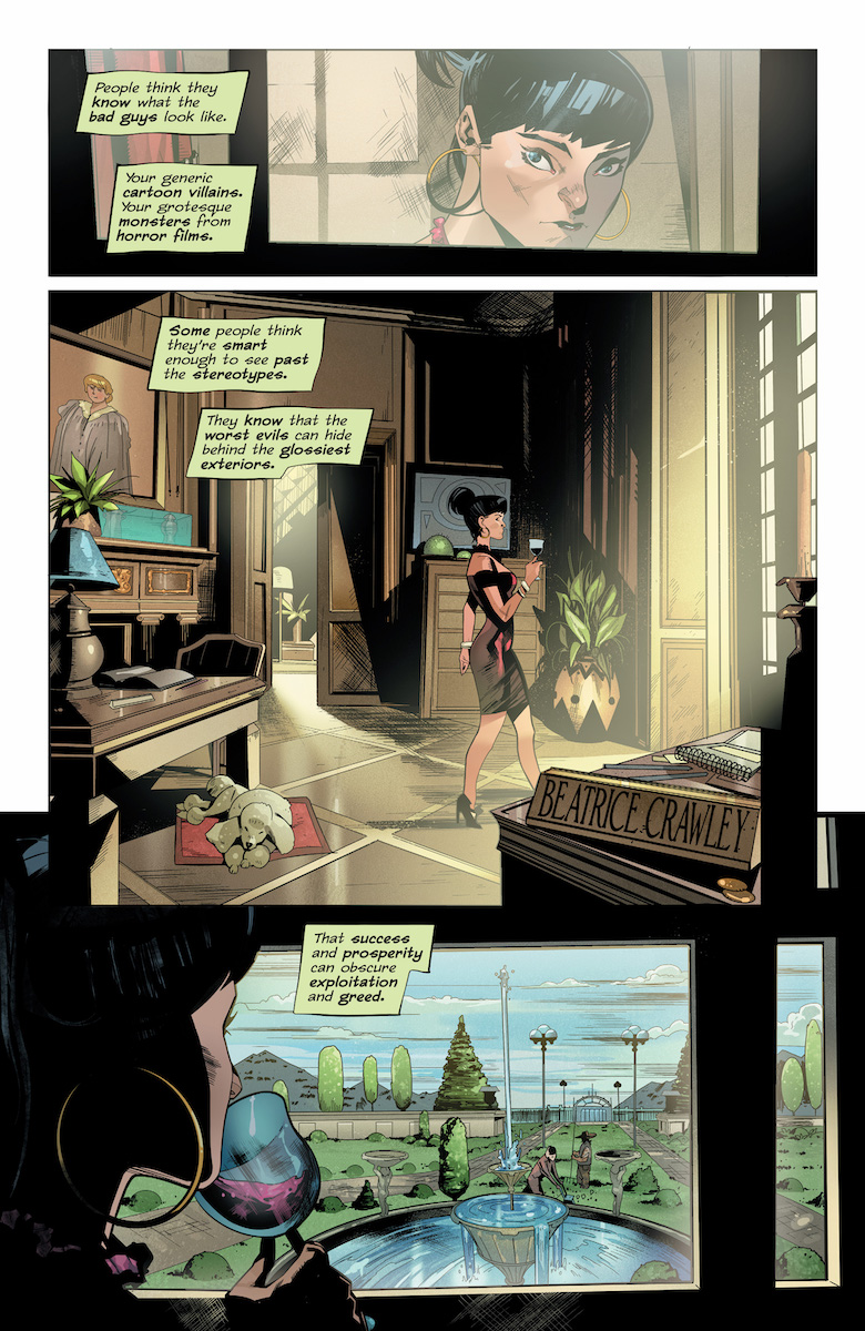 Ivy trying to infiltrate a company as a humble farmer is pretty funny, and this issue continues the series’ effective strategy of having her move around constantly, surrounding herself with a new supporting cast she never lets herself get attached to. What doesn’t work quite as well is the new villain, a powerful “girlboss” executive who oddly looks a lot like Punchline. Part of that is the guest artist, who has a smoother and more cartoony style than regular series artist Marcio Takara does. This is likely due to the sudden renewal of the series, but the overall story remains strong and I’m hoping we’ll get some interesting development for the villain next issue. She seems like a way to continue the threat of Woodrue, once her origin is hinted at. While there isn’t much time to explore her this issue, what we do get is a spectacularly weird last-page segment playing on the series’ love for body horror.