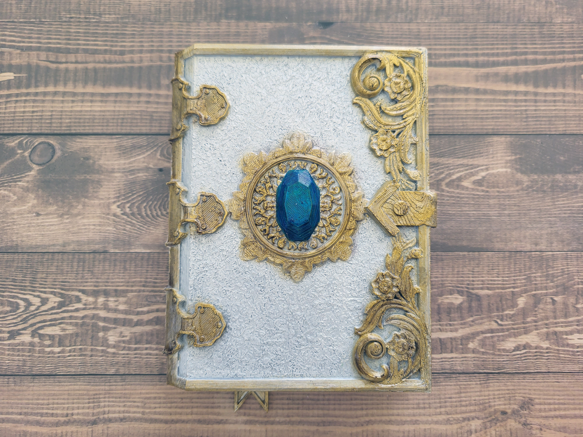 The final step was to seal things up. After some experimenting over time, we have found we like Rust-Oleum Clear Satin Enamel the best for overall sealing. I still wanted some of the bits to look shiny but not the whole book. To give a bit of extra shine to the gold parts and the jewel, I used a makeup brush and some brush-on gloss primer from the D&D Prismatic Line by Vallejo. It looks so much better than the first hollow spell book project we tried. Here’s a look at our finished project: