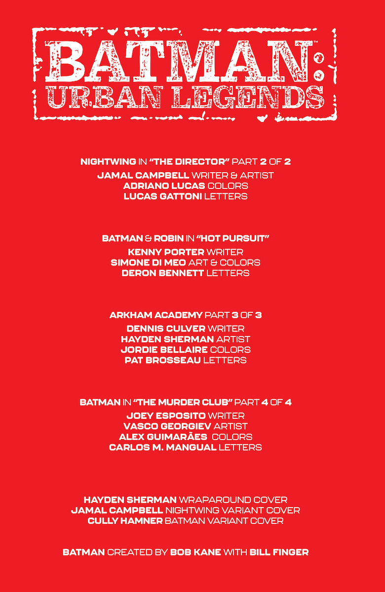 Batman: Urban Legends #23 – Jamal Campbell, Kenny Porter, Dennis Culver, Joey Esposito, Writers; Jamal Campbell, Simone Di Meo, Hayden Sherman, Vasco Georgiev, Artists; Adriano Lucas, Jordie Bellaire, Alex Guimaraes, Colorists