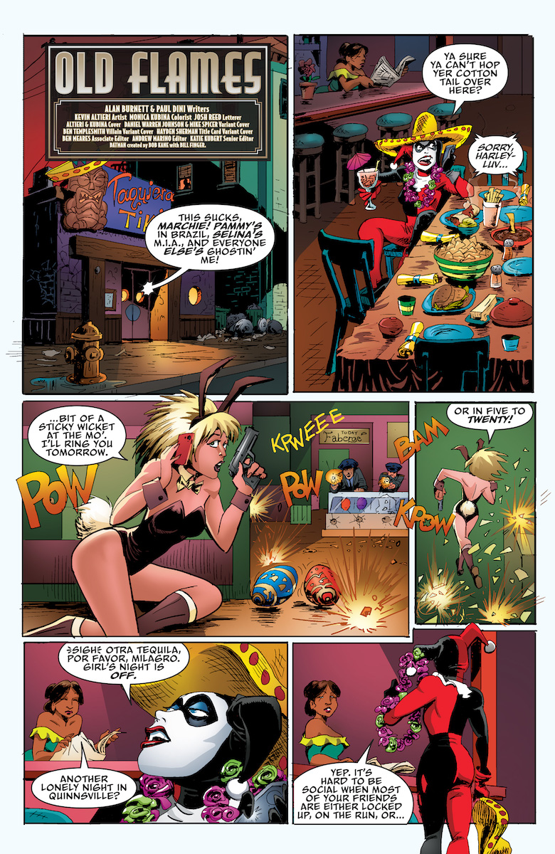 Ray: After a strong, noir-inspired first issue centered around the Gotham crime scene, this title takes a surprising left turn with what’s essentially a madcap action comedy starring Batman and Harley. New artist Kevin Altieri has a very different style, with shades of Kelley Jones on his Batman at times and very expressive faces, and that’s well-suited here. Harley is particularly lonely ever since she and Ivy were on the outs (due to a plant-related mishap). So it’s the perfect time for her old flame from college, Cassie Kendall, to show up—and Harley crashes into the rich woman’s life with her typical flair. There’s just one problem—Cassie is Bruce Wayne’s old flame too, and both of them have no idea that the new arrival was involved with the other one. Also, Cassie has been targeted by a highly organized gang of kidnappers who take her for ransom—which means the two old enemies have to work together.