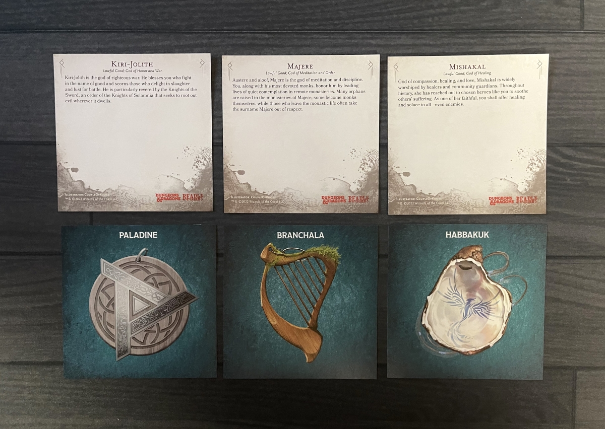 These cards introduce symbols for the Krynn pantheon. There are 21 deity affiliation cards to hand out to players.