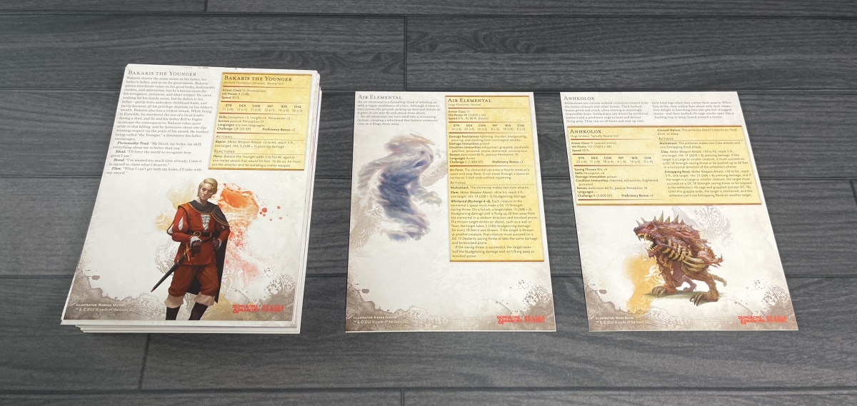 The encounter cards are designed to hang over the DM screen, so that the players can see an image of the character or monster, while the Dungeon Master has access to the stat block.