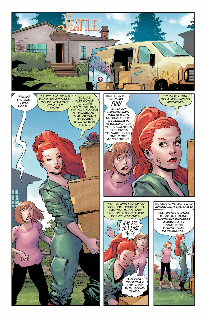 Ray: After last issue’s emotional moment of truth for Harley and Ivy, Ivy has regained her former self and is determined to undo her plan to end humanity, starting with returning to Gotham. There’s just one stop she has to make along the way—courtesy of Janet, the companion she picked up during an earlier attack on the chemical plant. While Janet seems to believe in Ivy and her cause, she’s still very human—and that means her perspective on how to help the environment is very difference. She’s obsessed with a lifestyle guru who preaches environmentalism and “Conscious capitalism”—something Ivy finds to be a joke. She agrees to take Janet to the retreat with an eye on possibly wiping the whole place out if need be, and mostly finds it to be a harmless place full of flakes—except for the shadowy being lurking around the fringes that reminds her a little too much of Jason Woodrue.