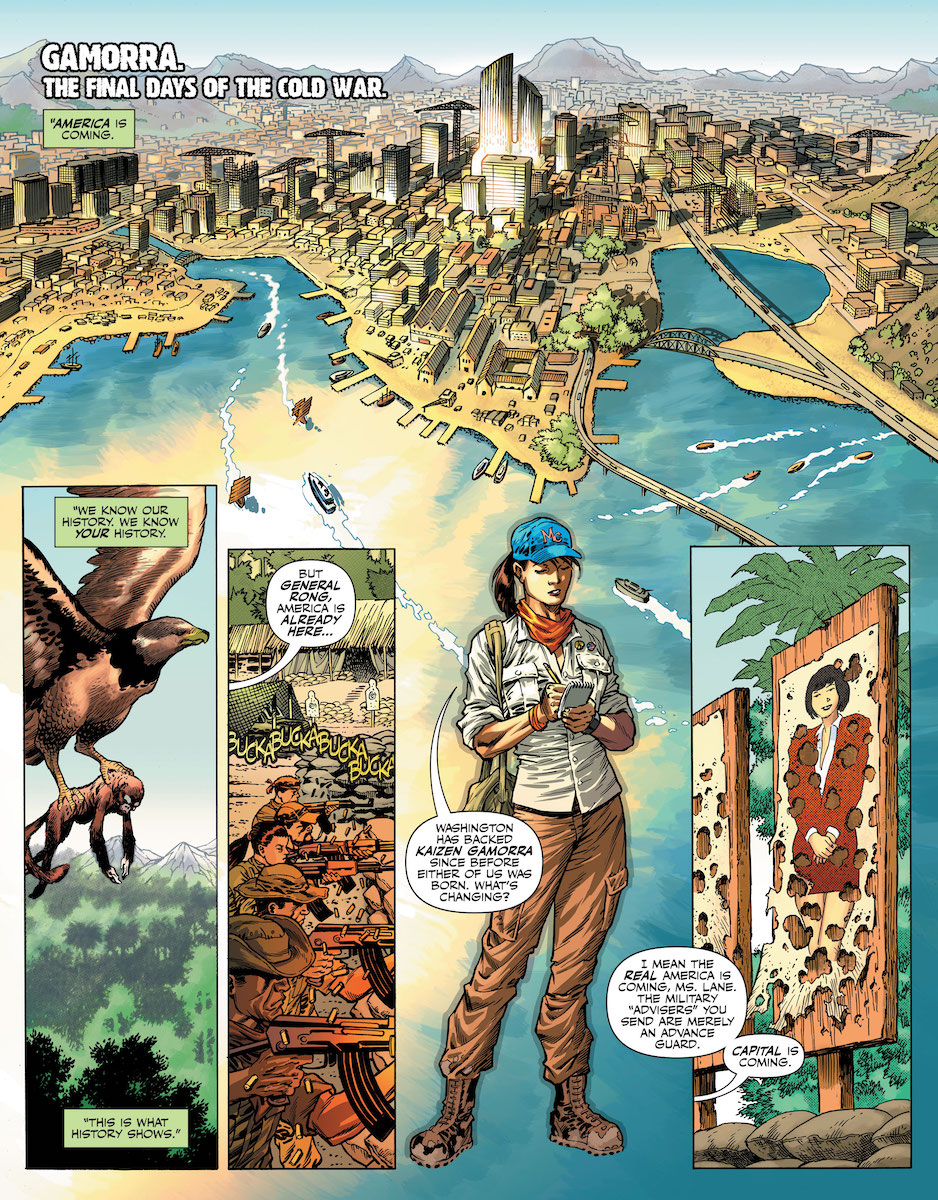 As bold and risk-taking as ever, Lois has found herself in the country of Gamorra just as it’s undergoing a rare transition of power. When her interview with the rebel leader is spiked by Steve Lombard, she heads to a backup plan—an interview with shadowy Inspector General Jackson King, who has a shocking story to tell about the fall of Stormwatch and the co-opting of Checkmate by an ambitious new black-side officer named Amanda Waller. While the Wildstorm characters are around the fringes of the story, the key players include some familiar DC faces—particularly Adeline Kane and her brutish unnamed enforcer who looks awfully familiar to long-time DC fans.
