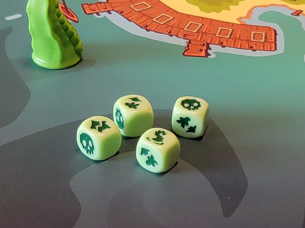 Once you’ve performed your actions (and, in some cases, spent a coin to take an extra action), it’s time for the tentacles to attack! A tentacle spawns in the water that corresponds to the region you took your turn in (up to four), and you get to roll DANGER DICE for each tentacle in the area.