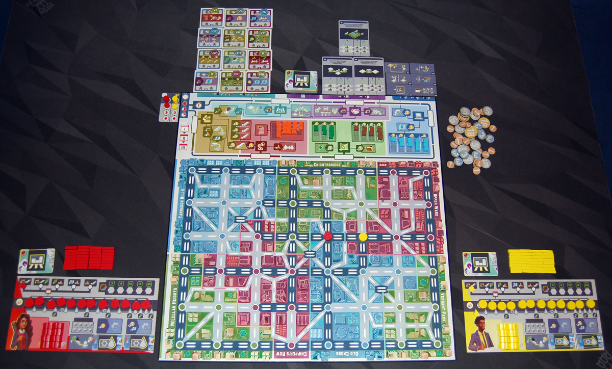 On the main board, place the various resources on the spaces in the four markets. In a 2-player game, don’t use the darker spaces. Next to the main board, you’ll place the turn order card (tucked so that there’s one column per player showing), some randomly drawn development tiles and project cards (depending on the player count), the deck of agenda cards, and the six different types of upgrade tiles (the number of each also depends on player count). Also, draw and place one random demand token on each development tile.