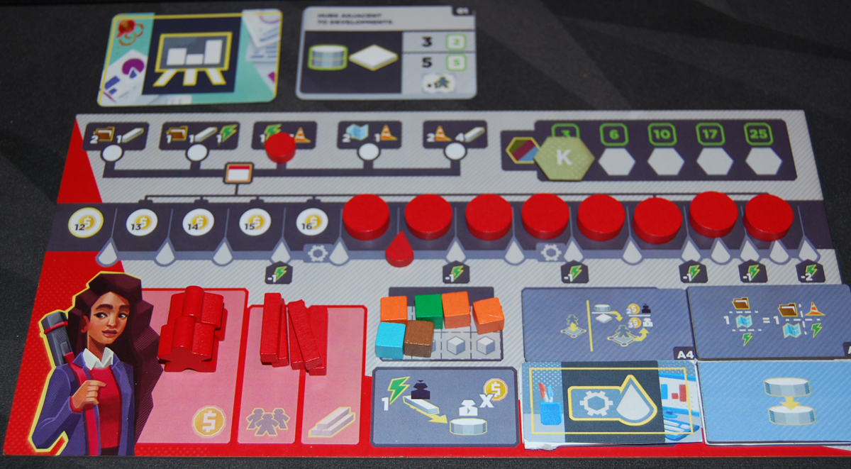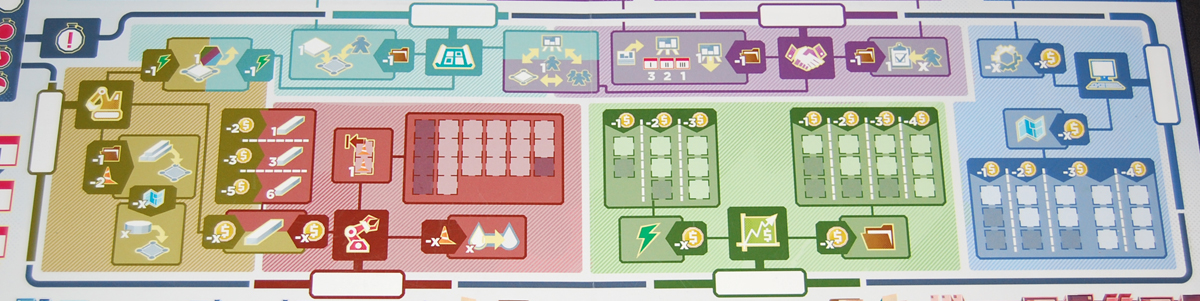 You will need a pretty big table to play this game if you’ve got more than 2 players—aside from the main board and the player boards, there are a lot of tiles and cards that are placed along the top edge of the board as well, so you need to account for a little extra space there.