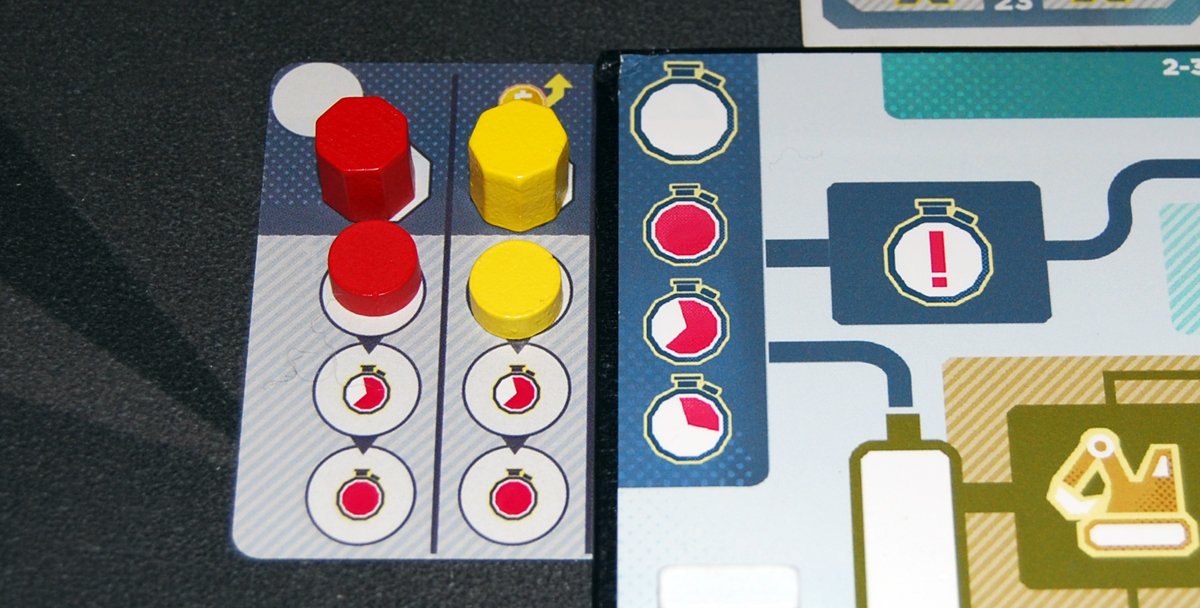 The resources themselves were wooden cubes in the prototype, but in the finished game will be shaped tokens—orange construction cones, green lightning bolts, brown folders, and blue blueprints. The shaped resources will definitely be better for color blind players than the cubes, but it remains to be seen whether they will be easier or harder to line up in rows and columns.