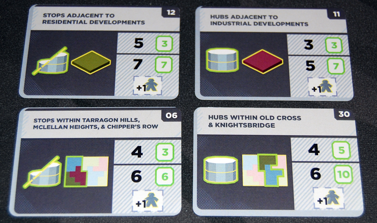 Some spaces allow you to add a development tile adjacent to one of your stations and then place a lobbyist on it. Development tiles make your stops worth points, and if you have your lobbyist on one, it also gives you access to an additional action or a bonus effect when you take particular actions. Once a development is placed, there’s another action that lets you claim the demand token (for end-game points) if you have a stop in the matching district.