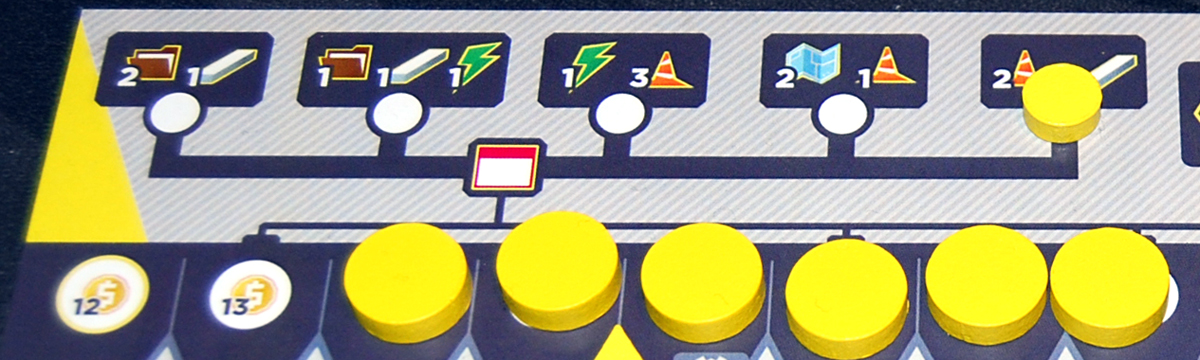 The construction market is a little different—instead of paying money for them, you simply claim the first available column, however much is there, so you can get as many as 4 construction in one action if the market is full. That means that if I spend just enough construction to start a new column, the next player to claim construction will only get a single resource. Gotta be careful, though—that player could be me.