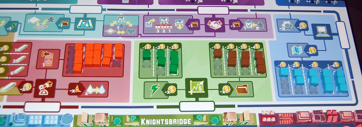 I won’t go into all the details about every action on the board, but most of the actions require spending money or resources, as indicated on the board. Also, there are a few actions that are positioned between two of the spaces, with both colors—these can be taken from either of those two spaces. You can purchase blueprints, permits, and power from the market—the fewer that remain, the more expensive they are—and you can collect construction by taking all of the cubes from the leftmost available column. You may also buy tracks and place them into your supply. You can collect more agenda cards (up to 3 total).