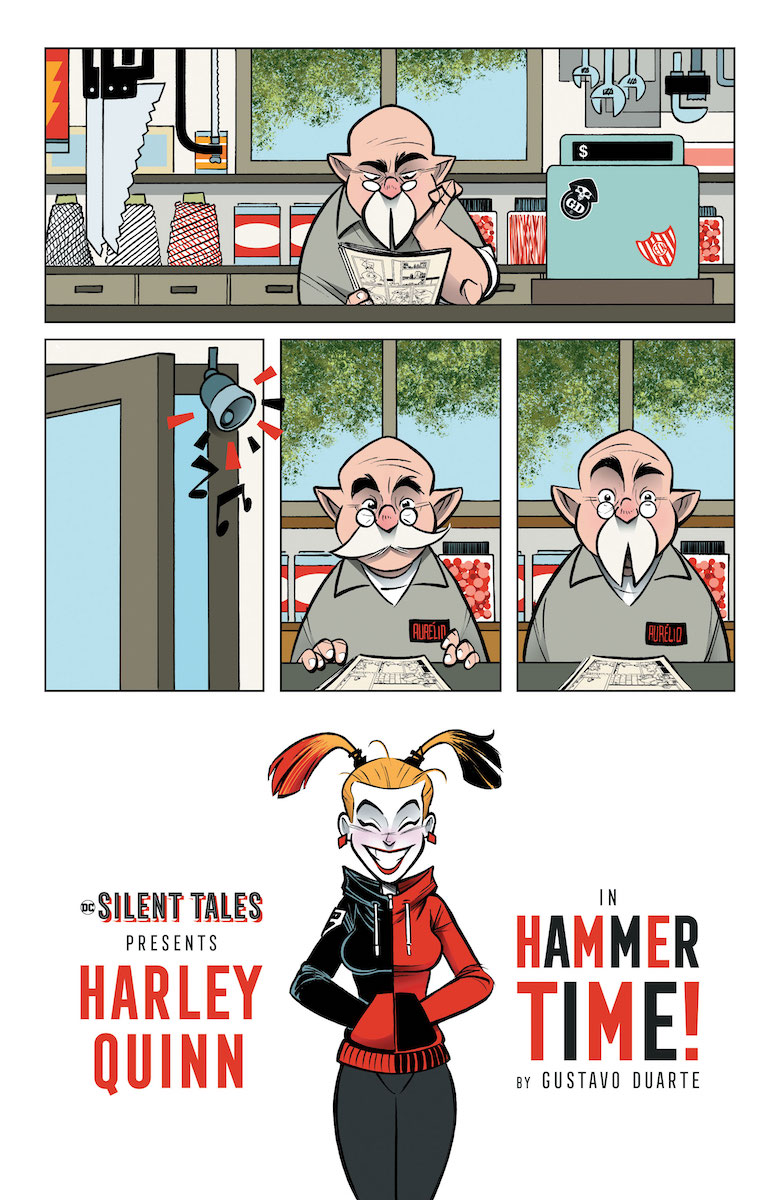 The first tale has Harley taking on the chore of mallet-shopping, as she visits a kindly old shopkeeper who guides her through the process. She picks out her mallet, pays him—and then bursts through the window and robs the confused old man. It’s about as chaotic as you’d expect for Harley.