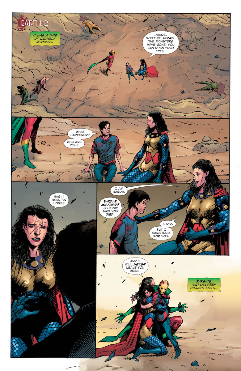 Ray: So, here we are—after three full-length minis and several spin-off series, the whole saga concludes here. Last issue saw Cyborg score a victory over the Anti-Life virus and successfully de-zombify several major characters—including reuniting the Free family and finally allowing Supergirl to meet her cousin. But the victory is tempered with horror, as the real villain is still out there—Erebos, the God of Darkness. This ancient primordial deity is more powerful than anything DC heroes have encountered before, and that’s enough to unite just about everyone against him—including new recruit Darkseid, cosmic force Black Racer, and long-time villain Ares. While the fight seems impossible, Damian comes up with a plan to enter Erebos’ impassable realm the only way they can—by dying and entering the realm beyond life, if only for a minute under controlled circumstances.