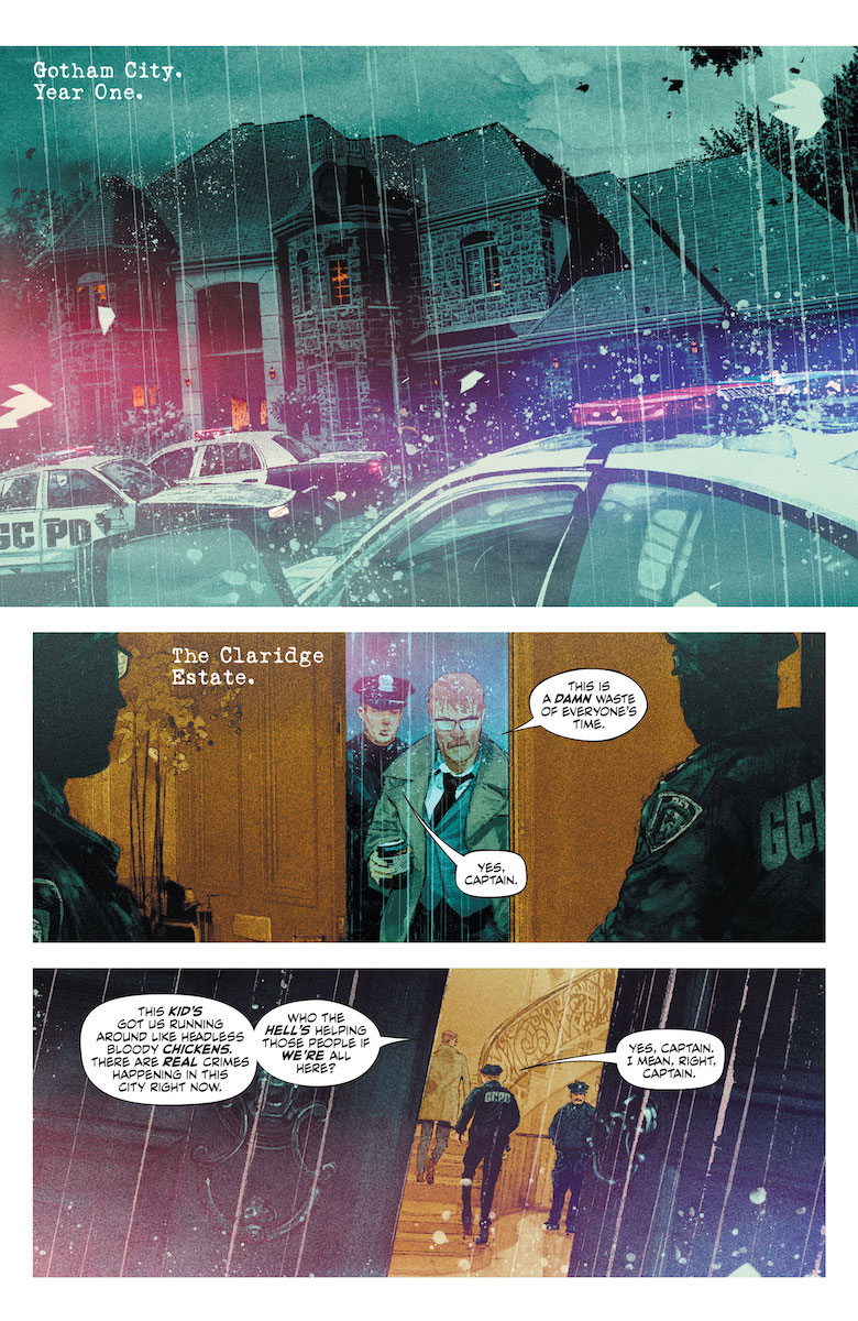 First up are one of DC’s most iconic creative teams, Tom King and Mitch Gerads on “Batman: The Winning Card.” A full-length story, this tale is set during the early days of Batman’s time in Gotham—and during the first day’s of Joker’s attack. It seems like a series of vignettes—Batman pursues a drunk and foul-mouthed petty criminal to the train tracks, Alfred keeps watch over a rather obnoxious guest waiting to meet Bruce, Jim Gordon, and his men guard a paranoid rich man who is convinced he’s about to be robbed and murdered, a desperate man searches for his missing daughter, and a little girl with a balloon sits in the rain and talks to an unusual pale-skinned man about some odd things. The stories seem disconnected at first, and then one by one they link up in a disturbing unveiling of just how ahead of the game Joker already is. No surprise, a King/Gerads book is likely to be excellent.