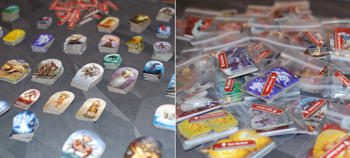 First up, there are a lot of map tiles—these have notches and knobs on the edges so that they can attach to each other, jigsaw-style, and each tile is double-sided so you get different artwork for the background. They’re labeled with numbers and letters, so all of the tiles of the same shape share a number. There isn’t an organizer for these included in the base box, so they just get piled on top of the trays.