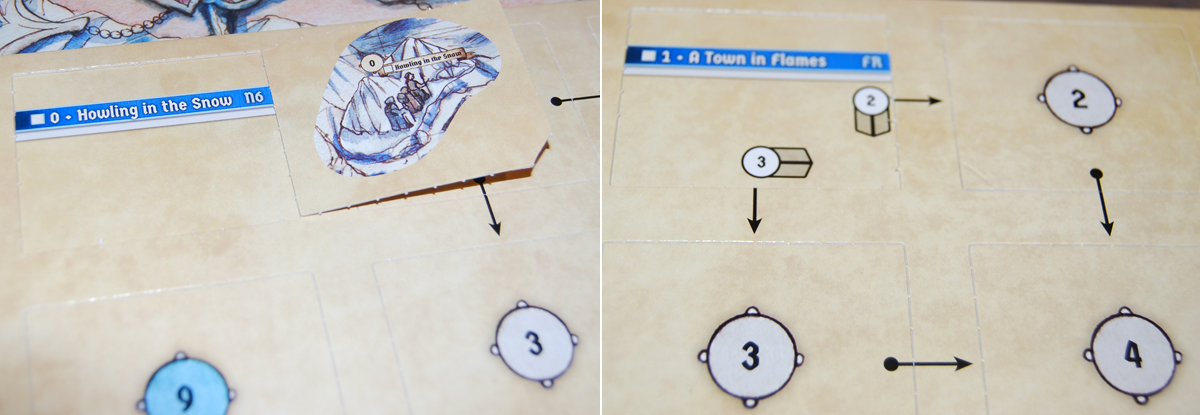 As you unlock scenarios, you open the flap on the flowchart, which reveals a sticker to put onto the board. The location coordinates are listed on the board, though it would have been nice to have it printed on the margin of the sticker too. The board itself just has the numbered circles, and when you place a sticker it will add the scenario title, as well as some more illustrations about that scenario. There will even be times when you place stickers on top of other stickers. Some stickers overlap the sections of the board that fold, and those stickers are cut into two pieces, but I’ve found that the cuts don’t always line up exactly right.