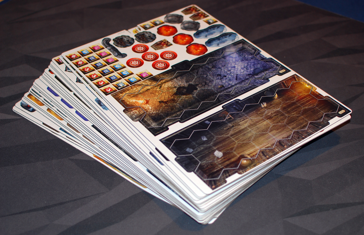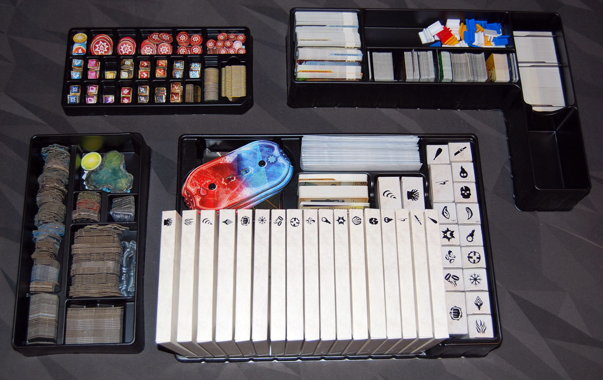 The photo above shows the plastic trays: the two on the left nest into each other (with lids); the top one includes all the various status token and damage tokens, and the larger tray has all of the overlay tiles for terrain, doors, special locations, and so on.