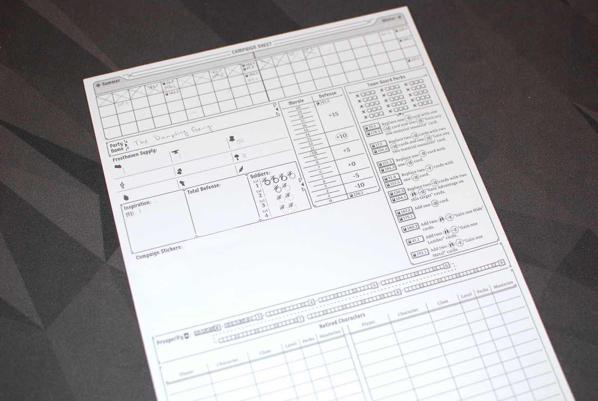 Your campaign sheet also tracks things like your morale (which can be spent for repairs or extra building), your soldiers (used to boost defense during an attack), and shared resources. Just like your character can earn perks to tweak your battle modifier deck, the town guard also has perks to modify the town guard deck—though my party hasn’t gotten to that stage yet! There’s also a section at the bottom of the sheet to record when a character retires—by fulfilling their personal quest.