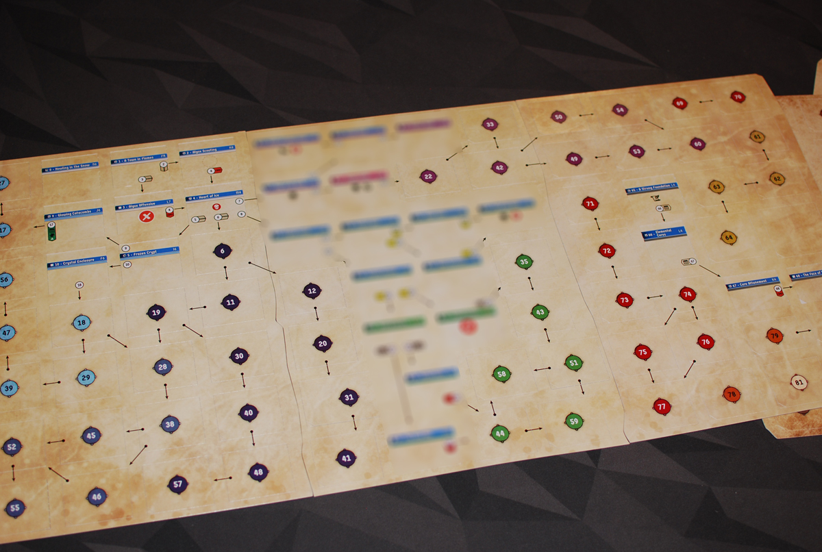 The scenario flowcharts are large sheets that show how one scenario leads into the next. Some are linear paths, and other times there are branching paths that you’ll take depending on the outcome of a scenario. There are scenarios that will unlock after a certain amount of time has passed, and there are others that you can’t play until you’ve made enough progress in the puzzle book.