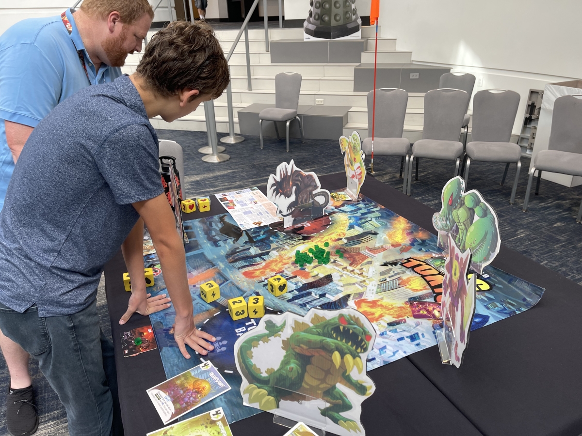 In the registration area are tables featuring a rotating selection of games for anyone to enjoy, many of them oversized like this King of Tokyo game: