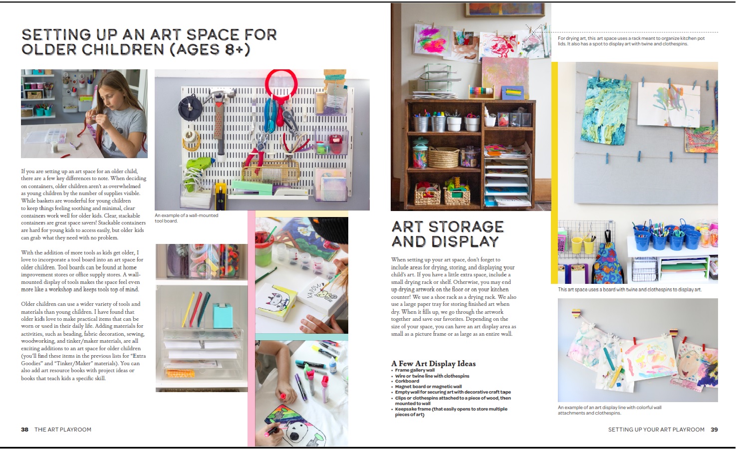 An art space can become a creative workshop that will allow children the opportunity to explore open-ended materials with a sense of independence, confidence, and responsibility. I especially appreciated the plus 8 years old ideas section because older kids are often neglected in this type of publication and they deserve their own space, too.