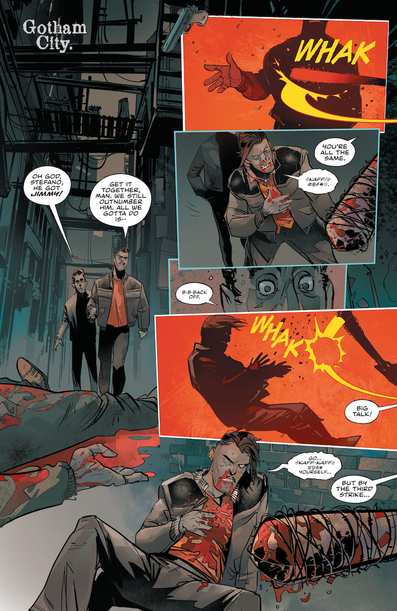 Ray: Tom King and Mitch Gerards’ story takes a break this month for a one-and-done tale by Culver and Otto Schmidt introducing a new villain—“Mr. Baseball.” Fans of The Walking Dead will recognize this villain’s MO immediately. When a friend of Matches Malone’s—Bruce’s criminal alter ego—turns up dead, it’s traced to a new baseball-obsessed criminal. As Batman attempts to protect a shady mob boss from his own sins, a story is revealed of a baseball-loving petty crook who crossed the wrong criminal, paid horribly, and was transformed from a nobody into a sadistic monster. This is a decent done-in-one story, but the villain is a little too reminiscent of Zsazs and other brutish Batman villains to feel like he’ll be a major player.