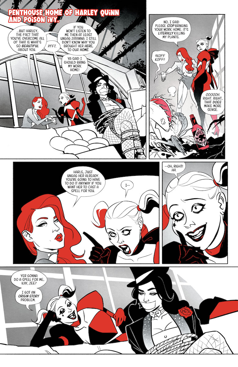 Thompson and Annie Wu kick us off with “Origin Stories for Dummies,” which finds Harley and a bemused Ivy dealing with a captured Zatanna. Harley’s kidnapped her because she wants a magical rewrite—she’s tired of having her origin tied to Joker, and wants an origin that’s more like Batman’s. That doesn’t work out, so she tries Superman—and it goes equally badly, as Joker keeps coming back into the picture. This is silly and meta, which is VERY fitting for Harley. Overall, it feels more like this is Thompson setting her tone for Harley Quinn and setting up the BOP series, and on those grounds, it’s excellent.