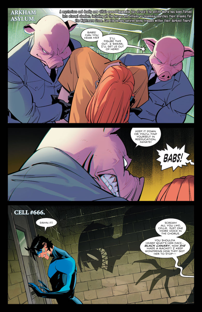 That sense of ambiguity serves this issue well, which takes on the tone of a spook-house mystery in the second half. The blood-stained catacombs that make up the back half of the asylum are genuinely creepy. I also like how even if they don’t get too much page time, this issue sort of serves as a backdoor epilogue to the writing team’s recent Batgirls series—giving us just enough info on what Cass and Steph’s nightmares would be and giving Barbara her own storyarc as she battles to maintain her humanity. As the issue enters its last act, we see Dick confront a cavalcade of his nightmares, going back to the very first trauma he ever experienced, as Insomnia battles to keep him from escaping. Most of these stories follow a similar pattern, but what makes the best stand out is that they put us in the shoes of the heroes as they experience their nightmares and make us feel their fear—and this issue hits that a few times.