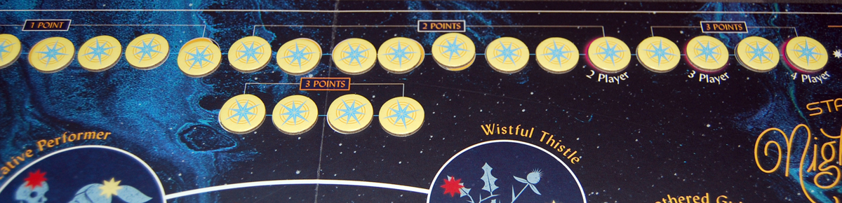 The stars are translucent plastic, giving them a nice sparkle. They’re small but not so small that they’re hard to handle, and by the end of the game, the main board will be covered with them.