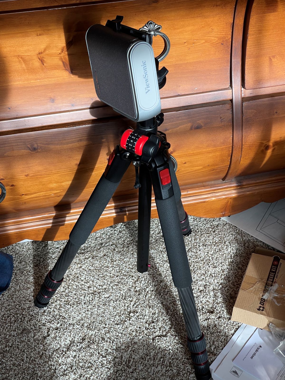 Thankfully, I also have the larger Viewsonic M1+, which does have a tripod mount. But this created yet another difficulty: my projector is an earlier model of the M1+, and it lacks Bluetooth connectivity. This means that I couldn’t set up a wireless Bluetooth speaker on the porch to provide sound for the digital decorations.