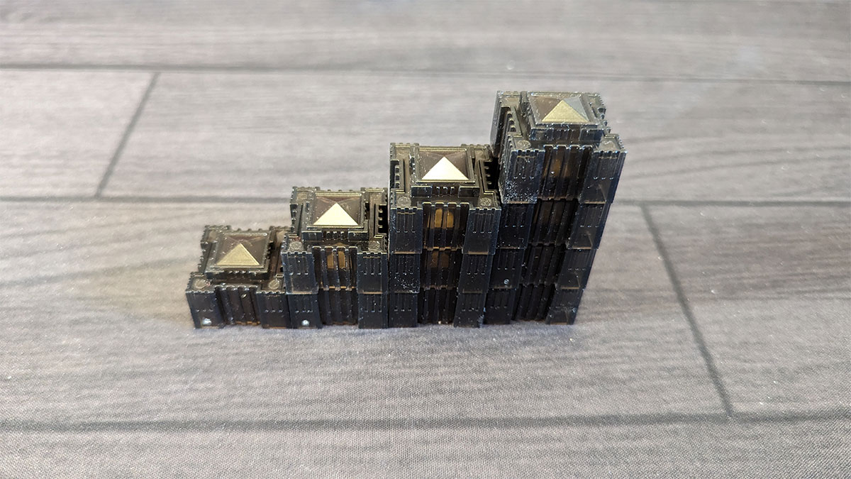 The plastic building pieces are pretty cool: they are all smokey grey, and look really great when stacked together on the board. They also stack nice and tightly. This does mean that they’ll end up partially stuck together when you take them out of the box, but when you’re playing, you can be certain none of the stacks are going to tip over, even when they’re bumped.