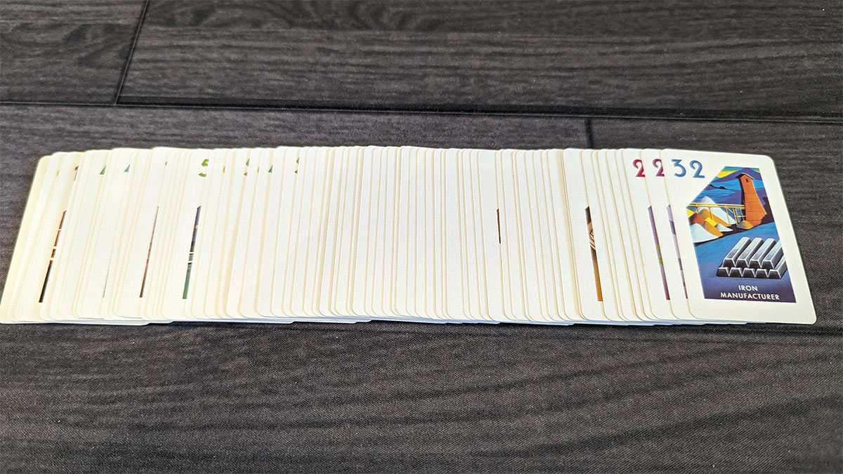 A nice little bonus here: players can discard their shares, industry, and level cards as they count their score, thereby simultaneously adding up their scores and starting to put the game away.