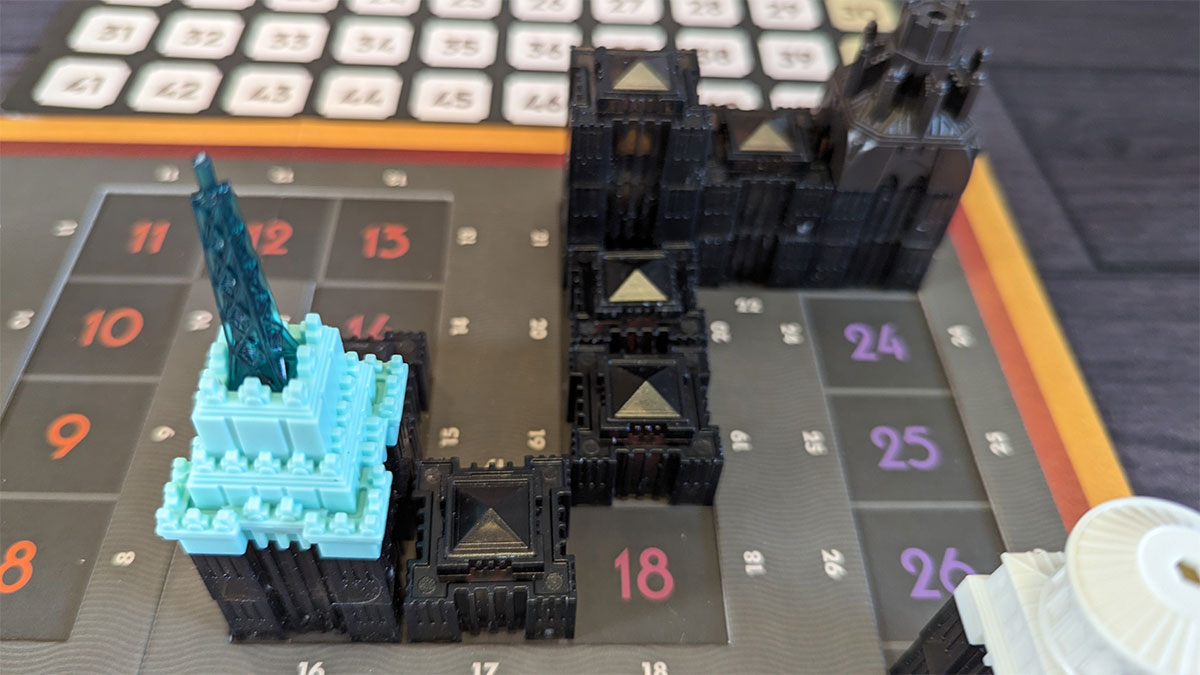 The board is dual-layered, with a numbered track that snakes around in a loop. Each space has a big, bold number in the middle, but then the number is also repeated on either side of the space, making it very easy to tell where each space is, even when buildings have already been placed on them.