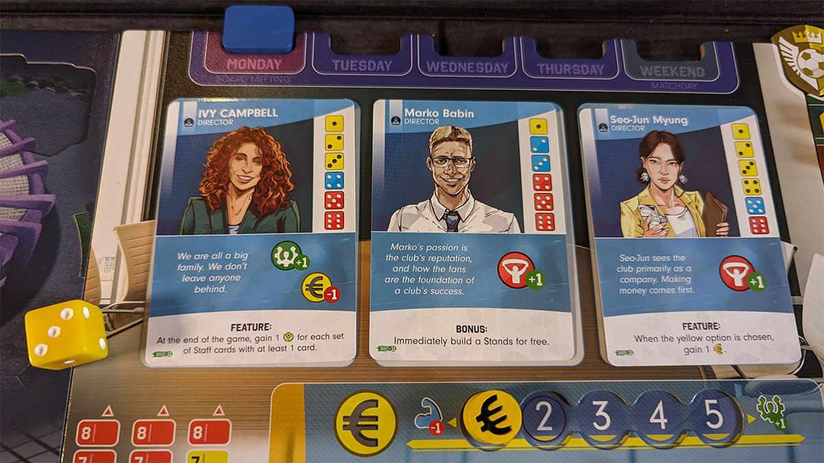 There’s a pretty cool mechanic here for the vote. Each board member card shows the six sides of the dice, with each colored yellow, blue, or red. Some directors will generally prefer yellow actions, and so may have three yellow dice, and maybe only one red. Others may be more even-handed and have equal numbers of each. Each player rolls a single 6-sided die and then checks their board members to see the result. A 1 will always be a unanimous decision for yellow, a 6 always unanimous for red, but the other numbers may be split. In the example below, a roll of a four would result in the blue decision, as two directors have blue four and the third a red four. A player may reroll the dice until they get the decision they want by spending one fan base resource per reroll. If there’s a tie—the number happens to be a different color on each director—you can reroll for free.