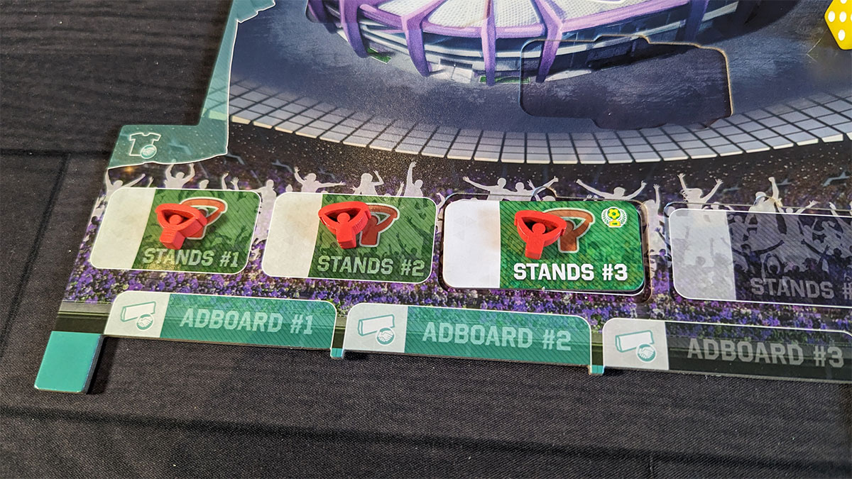 Once you have your lineup in place, you can put a single fan resource token on each stand token on your stadium. You will gain cash for them after the match. If you have upgraded to all four stands and placed one fan token in each, you have a sold-out match, which might be necessary for some additional effects on some cards (but won’t matter otherwise.)